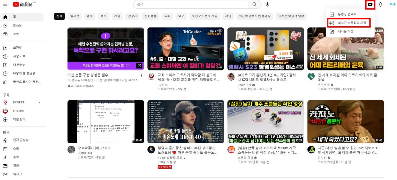 유튜브 초기 화면에서 카메라 버튼을 누른 후 실시간 스트리밍 시작 버튼을 눌러줍니다.