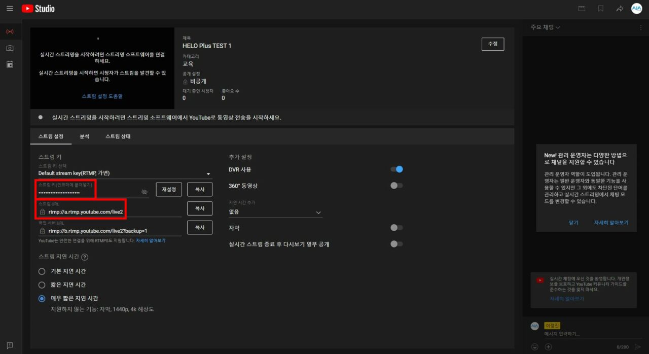 유튜브에서 스트림 설정 탭에서 복사했던 스트림 URL, 스트림 키 값을 넣어줍니다.