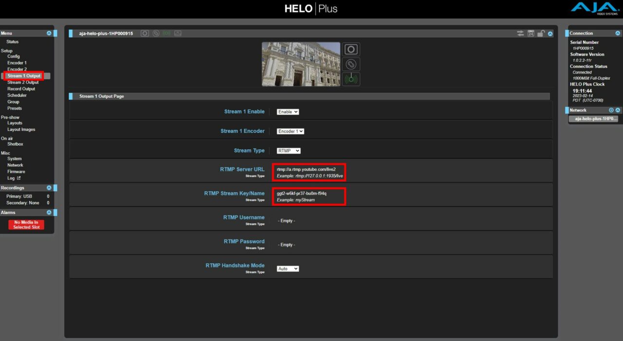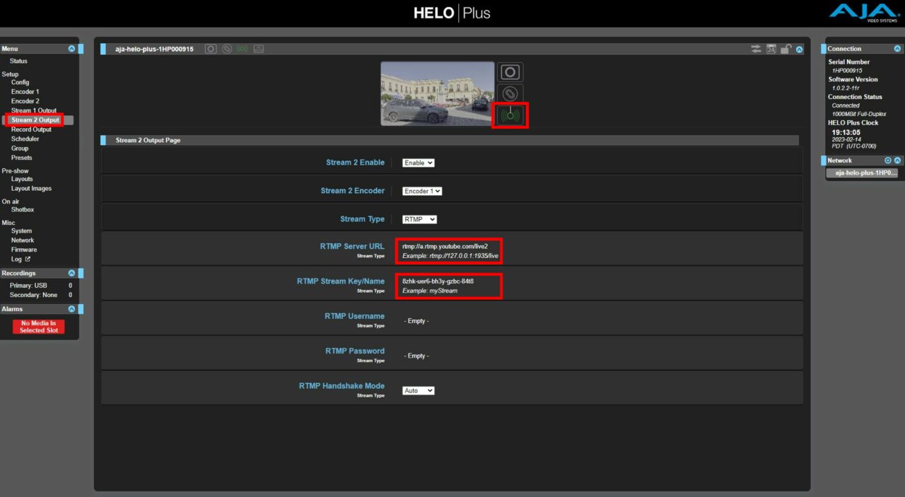 이와 동일하게 ‘Stream 2 Output’ 항목에서도 스트림 URL, 스트림 키 값을 넣어주면 HELO Plus의 WEB UI에서 스트리밍 버튼을 누르거나, 제품 전면에 스트리밍 버튼으로 듀얼스트리밍이 가능합니다.