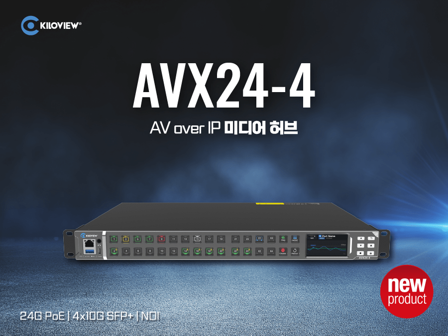AVX24-4는 24개의 기가비트 PoE 포트와 4개의 10G SFP+ 포트를 탑재하여, 고해상도 NDI 스트림을 병목 현상 없이 처리하는 AV-over-IP 전용 미디어 허브입니다. 네트워크 토폴로지를 시각화하는 지능형 모니터링 시스템을 통해 복잡한 설정 없이도 연결 상태를 직관적으로 파악하고 장애에 즉각 대응할 수 있는 전문 관리 기능을 제공합니다. 전면 4.3인치 LCD 터치스크린과 32개의 제어 버튼으로 PC 없이 현장에서 즉시 장비를 제어할 수 있으며, 이중화 전원을 통해 방송 및 라이브 현장에서의 안정성을 극대화했습니다.