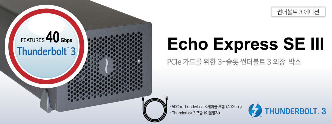 | 구성품 | ㆍEcho Express SE IIIe ㆍ범용 전원 어댑터 ㆍ전원 코드 ㆍ0.7 미터 Thunderbolt 3 (40Gbps) 케이블 ㆍThunderLok 3 Thunderbolt 커넥터 리테이너 클립 (8) |