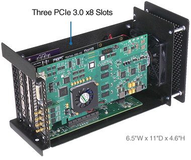 Echo Express SE IIIe의 PCIe 3.0 x8 슬롯은 절반 길이+, 전체 높이 PCIe 카드 3개 또는 단일 너비 카드 1개와 두 배의 너비 카드 1개를 지원합니다.