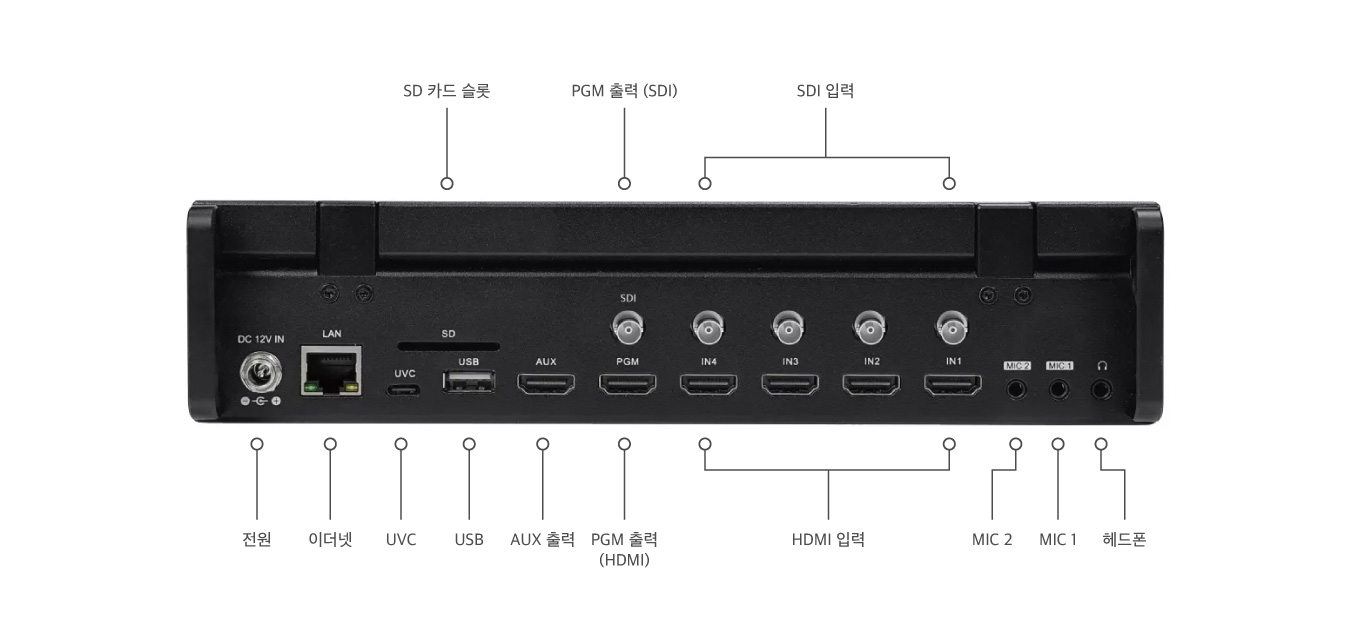 입력 옵션으로는 4개의 SDI 입력 단자와 4개의 HDMI 입력 단자가 있습니다. (N5는 4개의 HDMI 입력 단자) 2개의 HDMI 포트는 4K 입력을 지원하며, AUX 출력을 포함한 2개의 HDMI 출력 포트와 1개의 SDI 출력을 제공합니다.