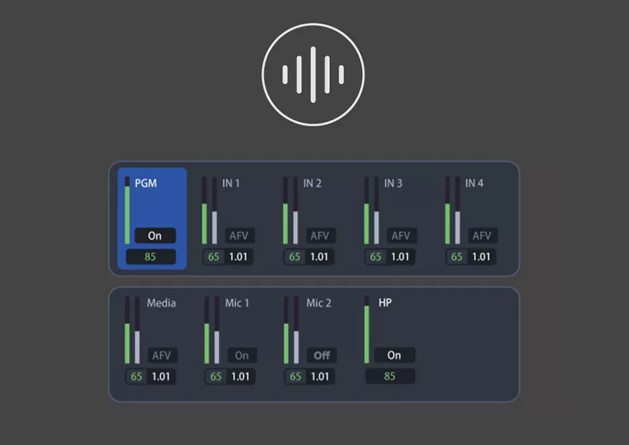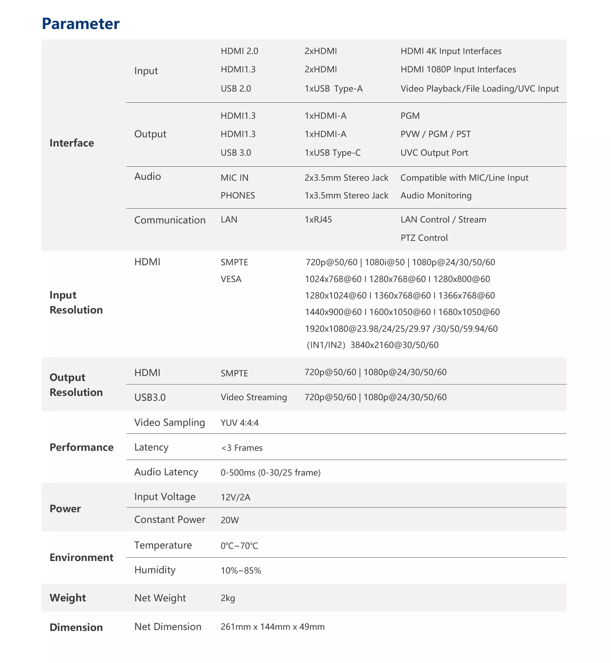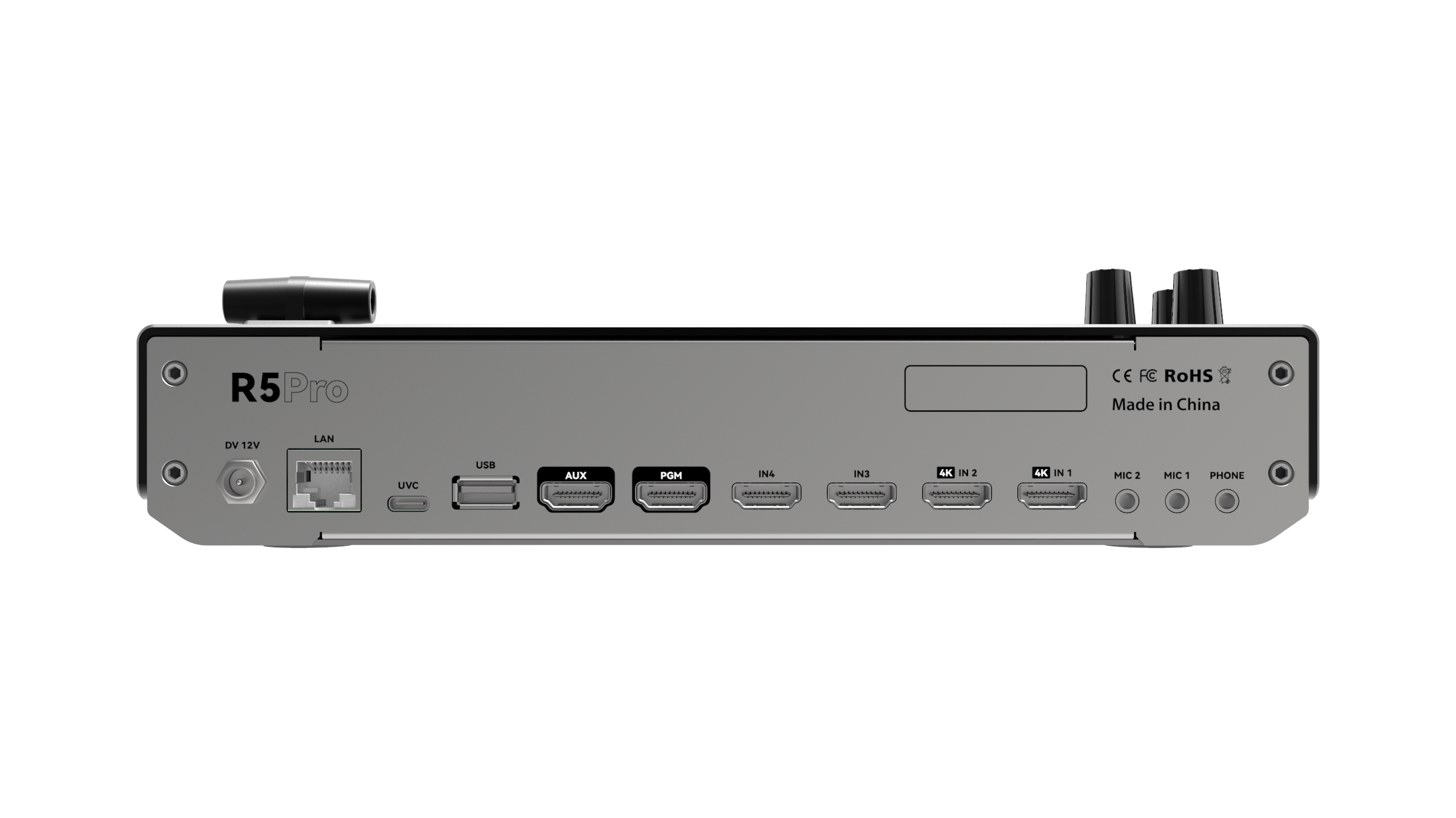 5개의 입력 채널과 멀티뷰 조합 전환 효과가 포함되어 있으며, 그 중 2개 채널은 4K 입력을 지원합니다. PGM과 독립적인 AUX 출력은 멀티뷰, 프리뷰, 개별 소스 모니터링으로 사용할 수 있으며 내장 스트리밍과 레코딩,  Lower Third 동적 오버레이 기능을 지원합니다.