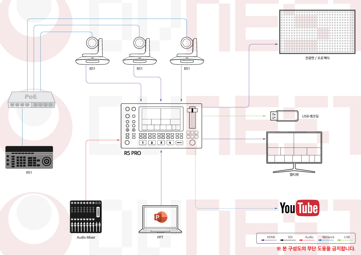 PTZ 카메라 / 오디오 장치 / PPT 등을 연결하여 간편한 이동형 프로덕션 솔루션을 구성할 수 있습니다.