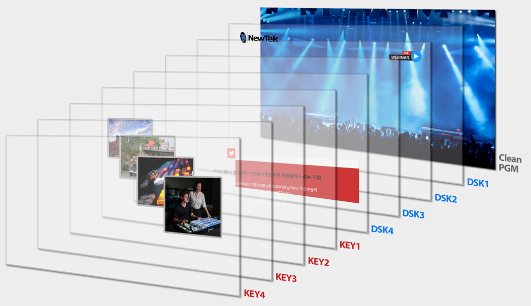 아무것도 건드릴 수 없는 DSK는 오히려 작업의 방해물입니다. TriCaster® 1 Pro는 4개의 DSK와 M/E별로 제공되는 4개의 KEY가 존재합니다. 각각의 다운스트림 키어는 위치 / 회전 / 크기 / 테두리 / 매크로 지정 등 다양한 기능을 수행할 수 있으며, 컨텐츠 불러오기와 적용하기 모두 자동화로 동작시킬 수 있는 첨단의 능력을 제공합니다.