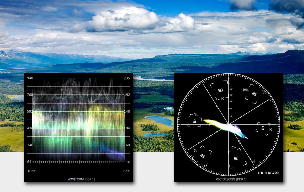 정확한 비디오 속성을 파악하기 위해 정확한 계측기를 사용하는 것이 중요합니다. TriCaster®는 자체 벡터 스코프와 웨이브폼 모니터를 가지고 있으며, 계측을 위한 소스를 지정할 수 있으므로 라이브 방송 중이라도 모든 종류의 입력 소스와 PGM 출력, 클린 PGM 출력 등을 계측할 수 있습니다. 사용자의 편의에 따라 벡터스코프 및 웨이브폼 모니터의 색상을 변경할 수 있습니다.