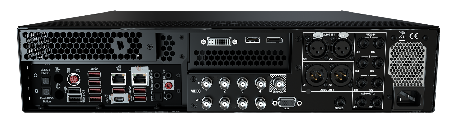 Audio: 부동소수, 96 kHz레이턴시 처리 ~1.0-1.5 프레임 A/V 표준 Tally HD15 GPI 커넥터를 통해 하드웨어 탤리(tally) 지원, NDI를 통해 네트워크 탤리 지원, Blackmagic Design® SDI 탤리 표준 지원 Genlock SD (바이레벨:Bi-level) 또는 HD (트라이레벨:Tri-level) 레퍼런스 신호 지원의 젠락(Genlock) 입력 GPI JLCooper Electronics의 eBox GPI 인터페이스를 통해 GPI 신호 지원 MIDI 서드-파티 장비 컨트롤 가능한 표준 MIDI 프로토콜 지원 시스템 드라이브 120GB SSD NIC • 1 x 10기가비트 이더넷