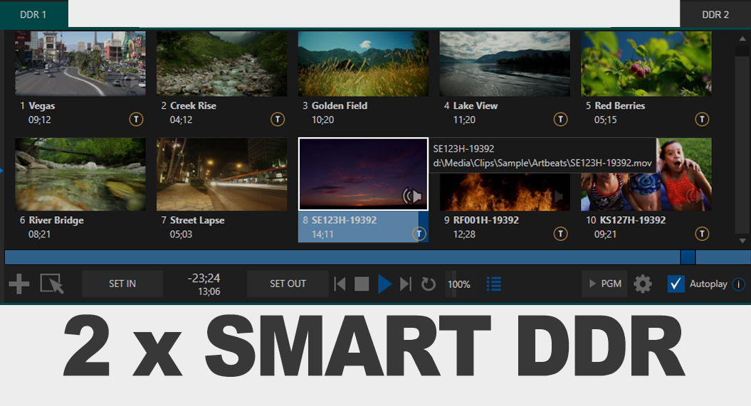 TriCaster® 1 Pro의 스마트 DDR은 그야말로 ‘똑똑한’ 운영이 가능한 첨단 비디오 재생 솔루션입니다. 플레이 리스트를 만들어서 각 클립별로 In / Out 점을 지정할 수 있으며, 영상 클립으로 화면전환이 될 때만 재생되는 ‘Auto Play’ 기능이 포함되어 있습니다. 반복재생이나 클립간 트랜지션, 슬로우모션 재생 등 지금까지 경험할 수 없었던 편리한 기능들이 제공됩니다.