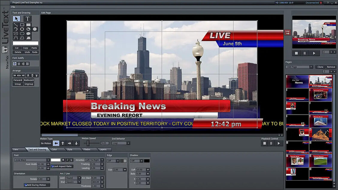지난 10년간 전세계 방송국의 다양한 방송 스타일 자막을 제공했던 LiveText™가 기본으로 제공됩니다. 그저 단순한 텍스트 출력뿐만 아니라 화려한 그래픽이 가미된 혁신적인 CG 타이틀을 직접 제작할 수 있습니다. LiveText™에서 제작된 자막은 TriCaster의 라이브 프로젝트에서 언제든지 내용을 바꾸어 즉시 사용할 수 있습니다.