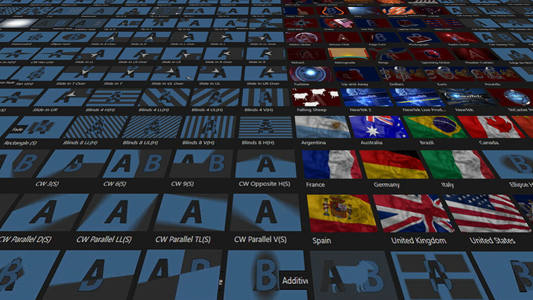아직도 화면 전환 효과 몇개에 제한되어 작업을 진행하십니까? TriCaster®는 기본 300개의 2D 및 3D 화면 전환 효과를 제공하고 있을 뿐 아니라, 기본으로 포함된 ‘Animation Store Creator’ 프로그램을 사용해서 에펙이나 3D 도구에서 제작한 이미지 시퀀스를 곧바로 트랜지션 효과로 만들 수 있습니다.